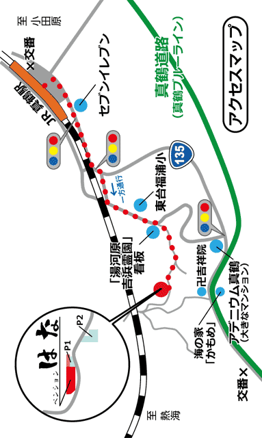 JR真鶴駅より徒歩15分です。お車の方は下記の地図を参考にお越し下さい。無料駐車場を完備しております。(台数には限りがあり、先着順となります)